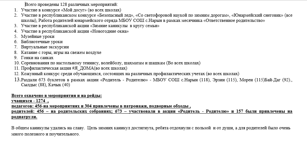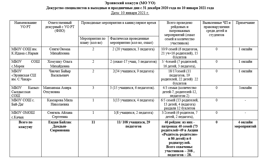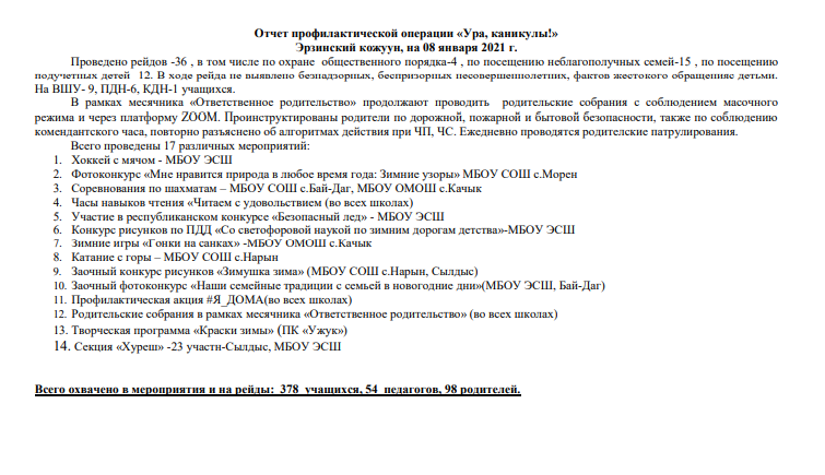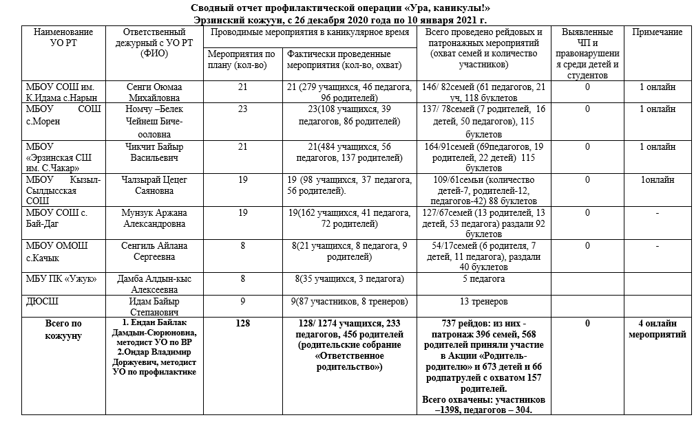 В целях усиления профилактических мер в рамках месячника «Ответственное родительство» и акции «Ура! Каникулы!» руководителями образовательных учреждений кожууна проведены инструктивные совещания с заместителями, социально-психологическими службами, классными руководителями.